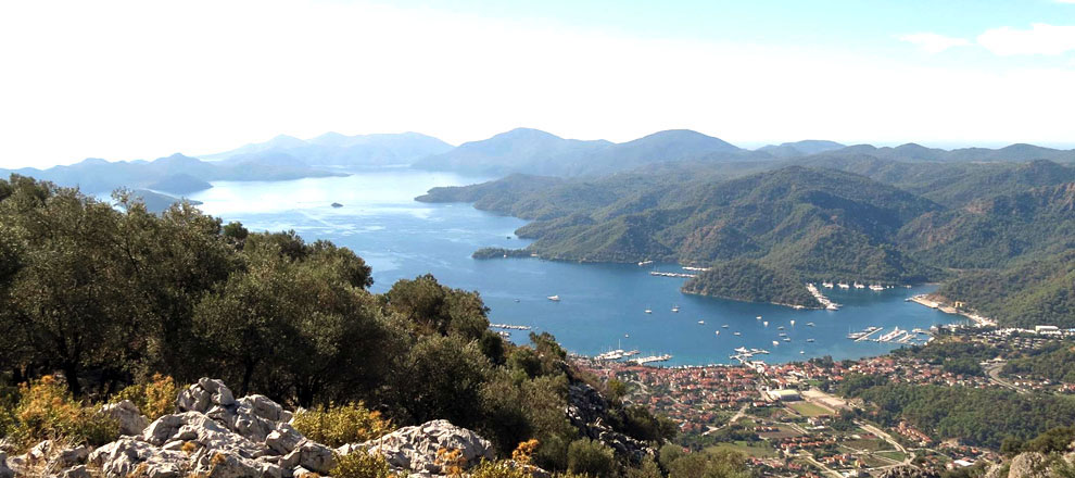 トルコ地中海沿岸の小さな町ギョジェキから緑深い山々を眺めつつ、リキュア文明遺跡の残る